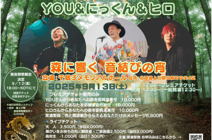 9/13(土)@北海道 「森に響く音結びの宵」 YOU&にっくん&ひろで出演! 千鶴子メモリアルホール https://ex-pa.jp/item/5...