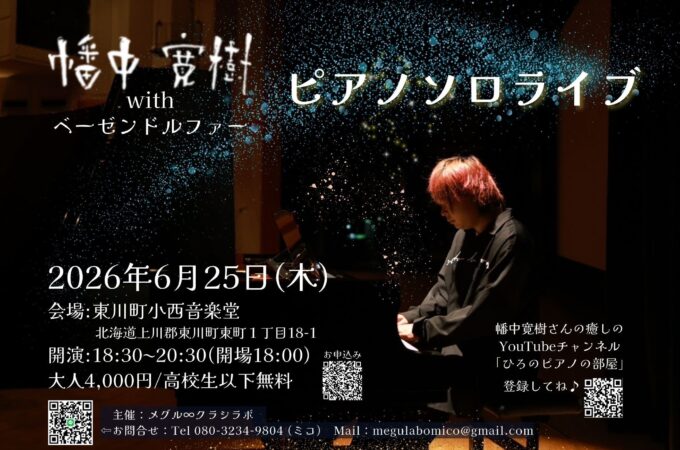 北海道初の幡中寛樹・ピアノソロライブが決定!ひろの弾くベーゼンドルファーの音色をぜひ聴きにきてね。 2026年6月25日(木)18:30〜20:30(...