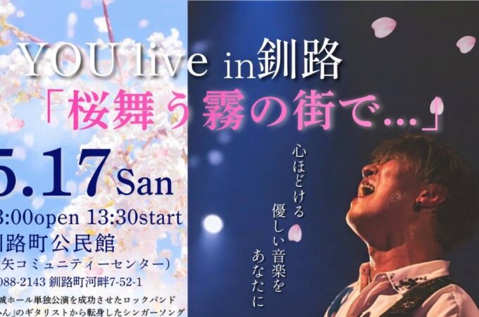 【日程】5月17日(日)13時30分スタート【会場】北海道・釧路町公民館シンガーソングライターYOUさんが北海道・釧路でLIVEを開催!ひろは、YOU...