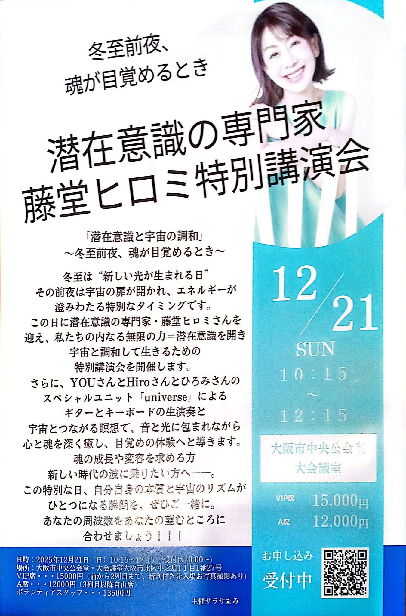 12/21(日)@大阪 藤堂ヒロミさん講演会「冬至前夜、魂が目覚めるとき」 ▶︎お申し込みはこちらから https://ameblo.jp/sarasamami/entry-12927789002.html その他情報 youtube登録者5000人記念オフラインイベント開催決定!! 11/29(土)@北海道 小野マッチスタイル邪兄出版記念講演会&YOUひろLIVE 12/6(土)@大阪 reunion2025 12/21(日)@大阪 藤堂ヒロミさん講演会「冬至前夜、魂が目覚めるとき」 12/22(月)@東京 時空フェス